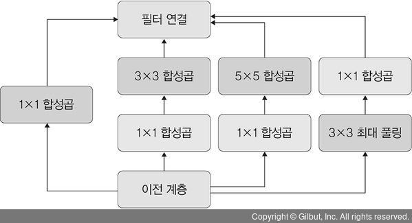 인셉션 모듈 : 특징을 효율적으로 추출하기 위해 1×1, 3×3, 5×5의 합성곱 연산을 각각 수행