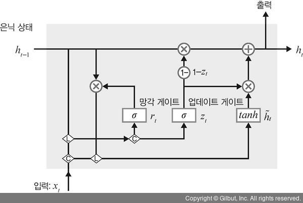 7.6 게이트 순환 신경망(GRU) GRU란? - 게이트 매커니즘이 적용된 RNN 프레임워크의 한 종류 - LSTM보다 간단한 구조 7.6.1 GRU 구조 GRU 구조 = LSTM에서 사용하는 망각 게이트와 입력 게이트를 하나로 합침 + 업데이트 게이트 특징 · 하나의 게이트 컨트롤러가 망각 게이트와 입력 게이트를 모두 제어함 - 게이트 컨트롤러가 1을 출력 → 망각 게이트 open, 입력 게이트 close - 게이트 컨트롤러가 0을 출력 → 망각 게이트 close, 입력 게이트 open ⇒ 이전 기억이 저장될 때마다, 단계별 입력은 삭제됨 //망각 게이트 open = 직전 기억을 메모리에 저장 //입력 게이트 open = 현재 메모리에 새로운 정보를 반영함 · 출력 게이트가 없음 → 전체 상태 벡터가 ..